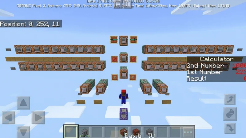 This is a completely operational calculator that utilizes the scoreboard functionality introduced in Minecraft beta version 1.7.0.2. This incredibly powerful calculator can handle calculations for any numbers ranging from -2147483647 to 2147483647. All of its features are implemented solely through command blocks. A "no mod" creation refers to something built with command blocks that introduces new game mechanics, like items or features, without requiring the installation of a mod or add-on.