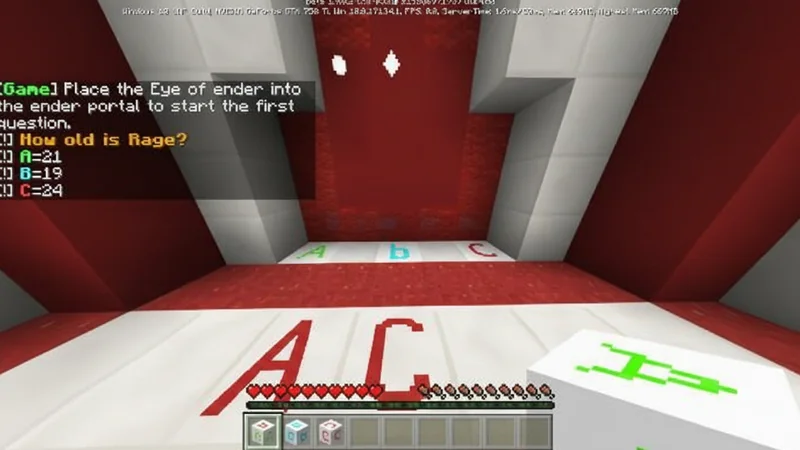 This trivia map focuses on the YouTuber Rage Elixir and was created to celebrate his birthday. Players must answer questions about Rage Elixir to progress. Correct answers will grant you valuable gear, which is essential for the final confrontation against the formidable evil Rage Elixir boss. To play, begin by answering the provided questions. You'll find three distinct blocks (A, B, and C) in your inventory for each question. Select your answer by placing the corresponding block onto its matching space. Success will reward you with gear, while incorrect answers yield no rewards.
