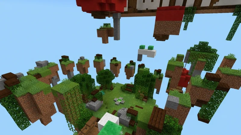 Sky Wars is a highly competitive mini-game where eight players participate. Each player starts on their own island, and the objective is to avoid falling into the void. On every island, you'll find chests containing blocks, tools, and potions. The ultimate goal is to be the last player standing.